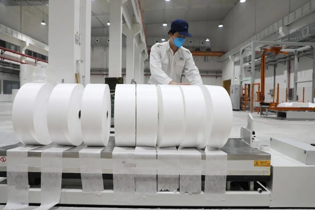 項(xiàng)目引進(jìn)美國(guó)進(jìn)口孖紡生產(chǎn)線,生產(chǎn)50~200gsm克重產(chǎn)品,運(yùn)行車速為250m/min,年生產(chǎn)能力為8000~9000噸,是亞洲第一條孖紡高分子吸附新材料生產(chǎn)線。生產(chǎn)的孖紡產(chǎn)品可廣泛應(yīng)用于口罩、防護(hù)服、手術(shù)墊、護(hù)理墊、洞巾等醫(yī)療防護(hù)用品的過濾芯層,以及高檔濕巾、隔音隔熱材料等領(lǐng)域。