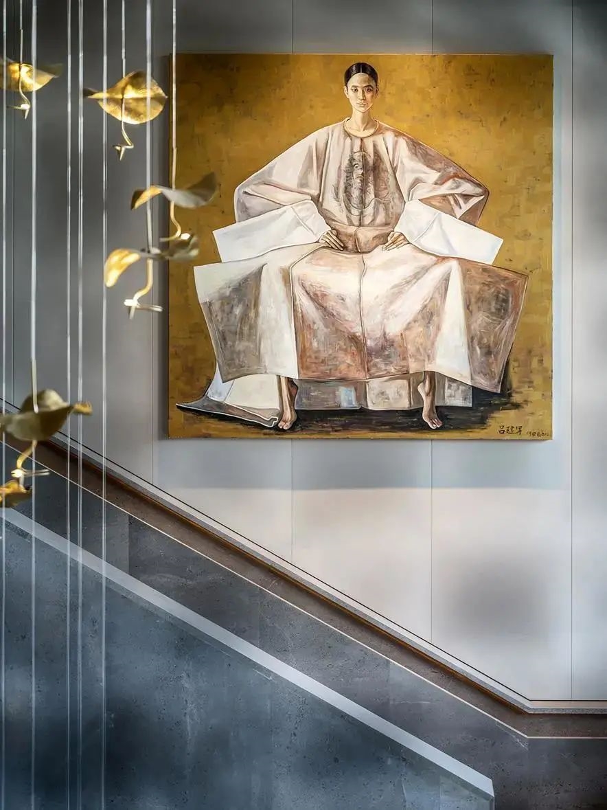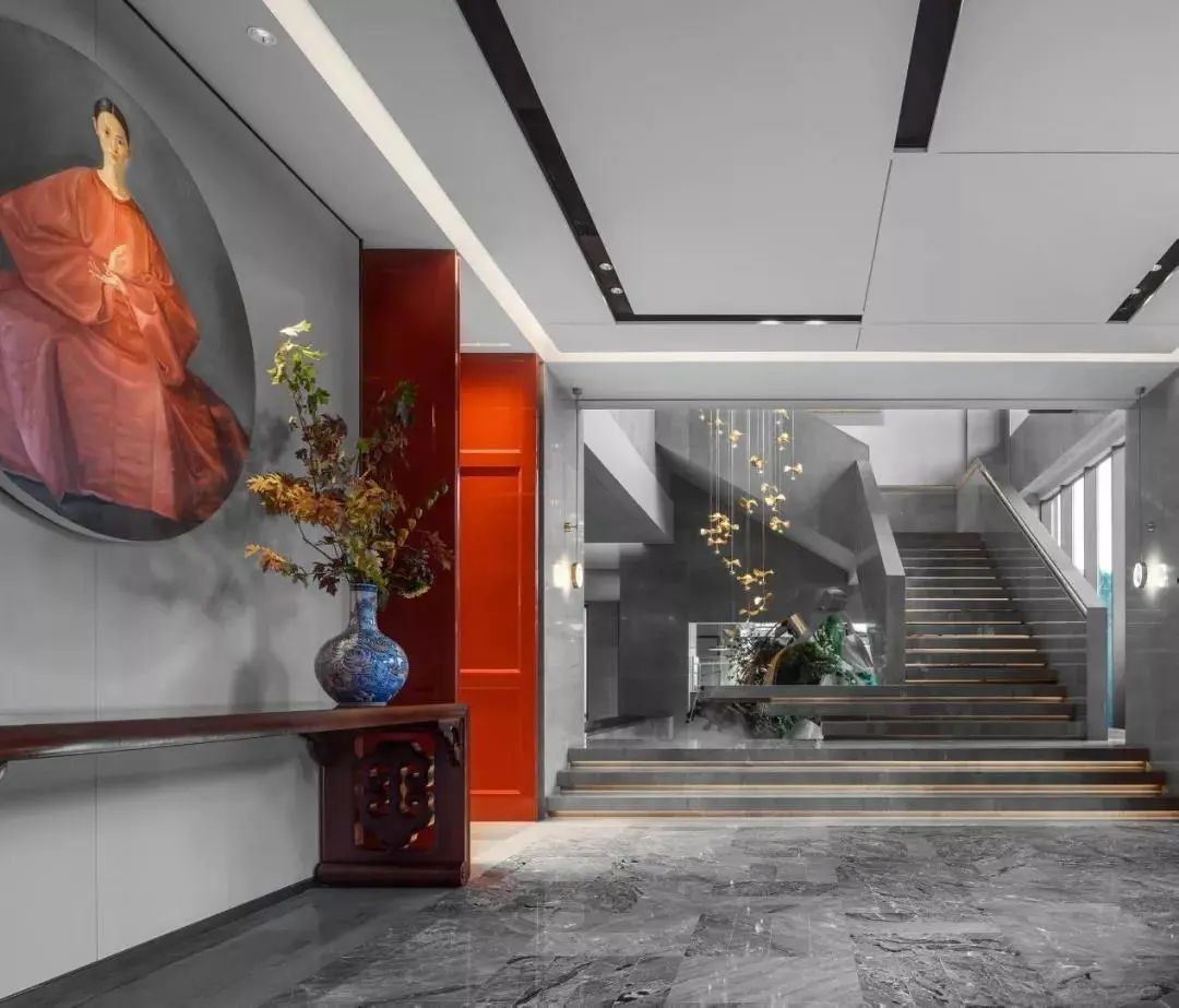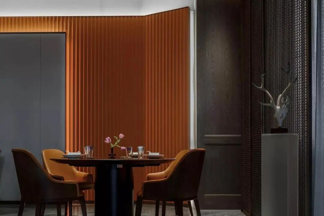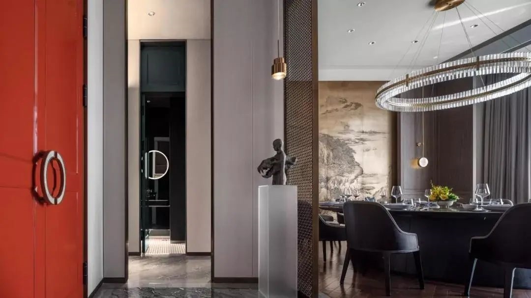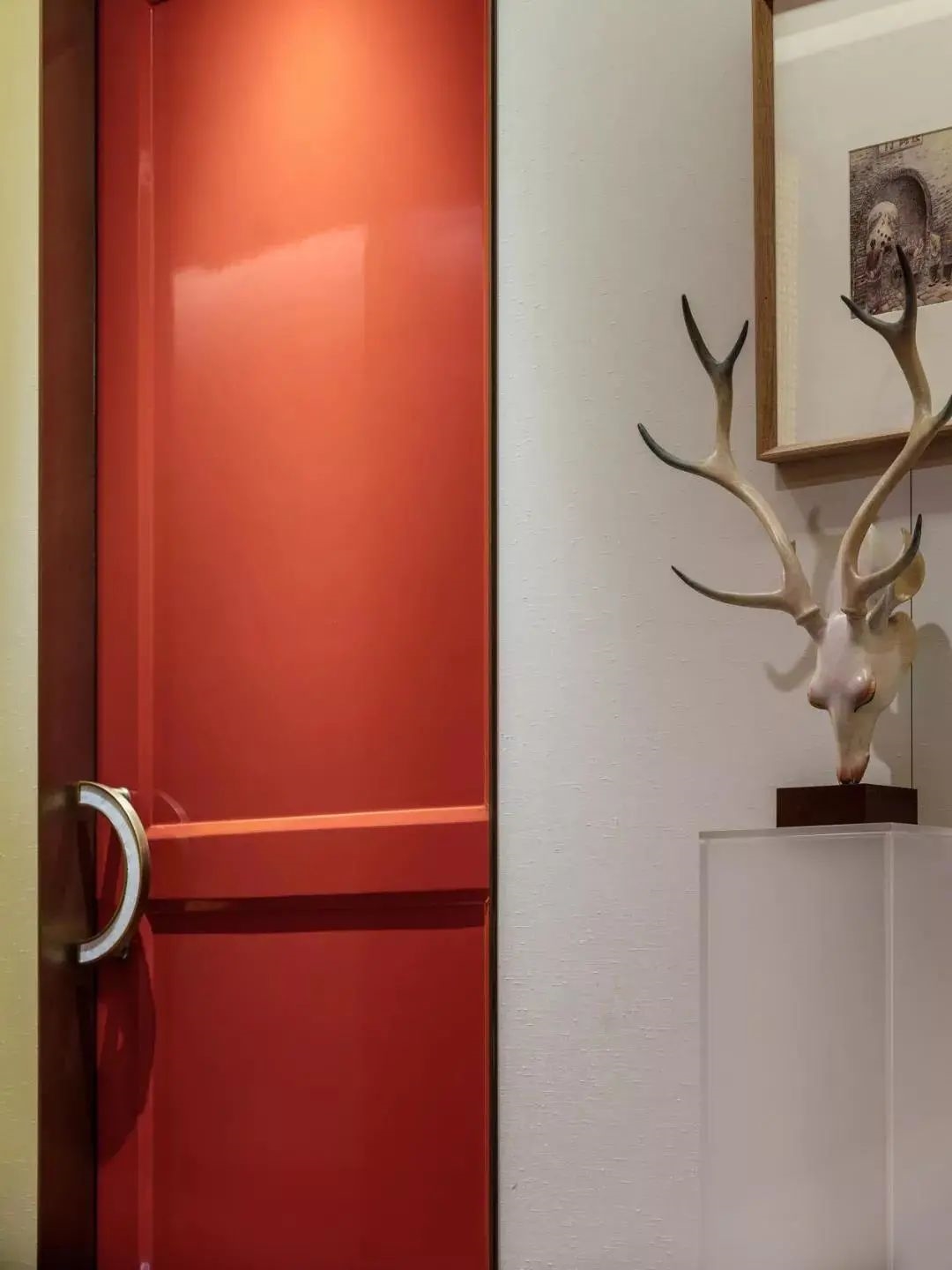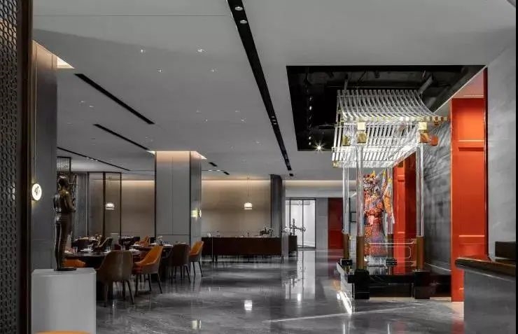 一步一景,一眼一畫,隨著動線從大堂進(jìn)入主餐廳,中國紅在餐廳暈染開來,點綴鑲嵌于門上,掛畫間,飾品處,在整體暖高級灰的主色調(diào)下鋪以純正的京紅反而映襯出鬧中取靜的東方之魂。