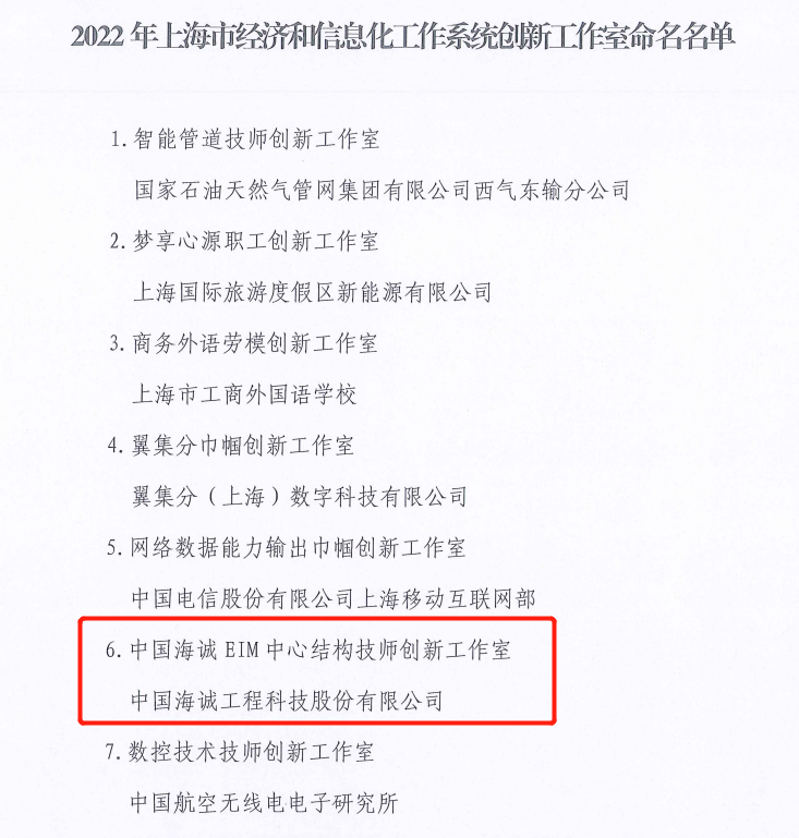 7月12日,上海市經(jīng)濟(jì)和信息化工作系統(tǒng)工會(huì)工作委員會(huì)正式發(fā)布了《關(guān)于命名2022年海市經(jīng)濟(jì)和信息化工作系統(tǒng)創(chuàng)新工作室的決定》,市經(jīng)信系統(tǒng)工會(huì)授予“中國海誠EIM數(shù)創(chuàng)中心結(jié)構(gòu)技師創(chuàng)新工作室”。