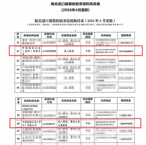 近日,中輕檢驗(yàn)認(rèn)證(晉江)有限公司、中輕檢驗(yàn)認(rèn)證(浙江)有限公司(原名:中輕檢驗(yàn)認(rèn)證〔溫嶺〕有限公司)均成功入選國(guó)家海關(guān)總署《海關(guān)進(jìn)口服裝檢驗(yàn)采信機(jī)構(gòu)目錄》。這充分體現(xiàn)國(guó)家權(quán)威部門對(duì)中輕檢驗(yàn)技術(shù)實(shí)力與服務(wù)水平的高度認(rèn)可,彰顯其在輕工紡織檢測(cè)領(lǐng)域?qū)I(yè)優(yōu)勢(shì)與行業(yè)影響力。