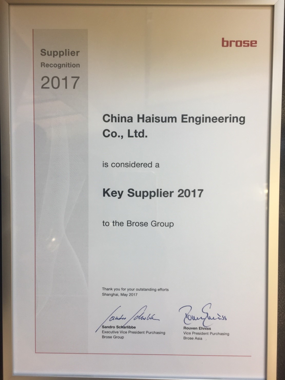 日前,為感謝公司對博澤公司的貢獻,博澤集團授予海誠“2017核心供應商”的稱號。