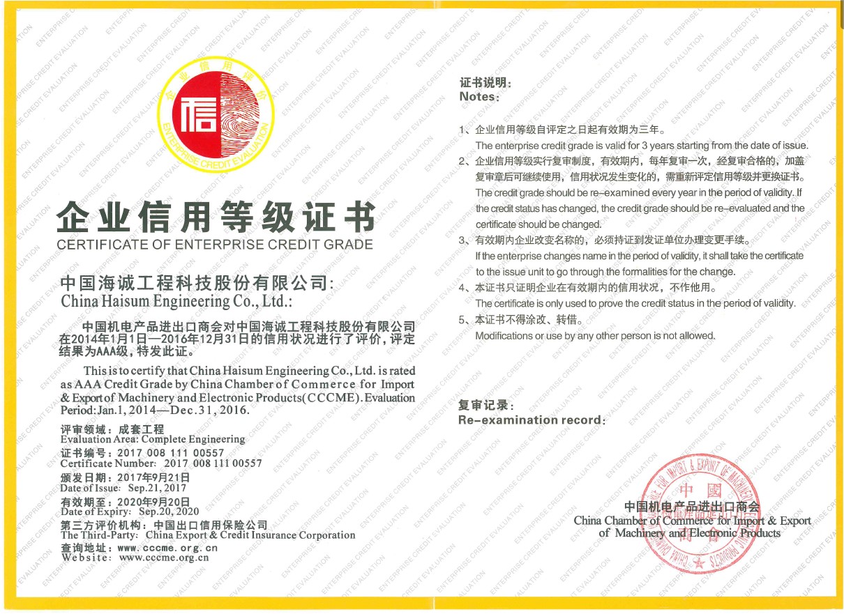 中國(guó)機(jī)電產(chǎn)品進(jìn)出口商會(huì)由國(guó)資委批準(zhǔn)成立,是全國(guó)首批信用評(píng)價(jià)試點(diǎn)單位,是我國(guó)從事機(jī)電產(chǎn)品進(jìn)出口貿(mào)易相關(guān)活動(dòng)的全國(guó)性行業(yè)組織。中國(guó)海誠(chéng)股份自參加成套工程領(lǐng)域信用評(píng)價(jià)以來(lái),連續(xù)獲得成套工程領(lǐng)域AAA級(jí)信用企業(yè)稱號(hào)。