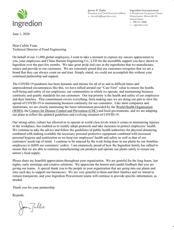 日前,海誠股份食品總監(jiān)袁蔡斌收到一封來自美國宜瑞安集團(Inredion Incorporated)首席執(zhí)行官詹姆斯•扎利(James Zallie)先生的感謝信,信中對公司的宜瑞安五星項目設計團隊以及項目經(jīng)理黃萍,在新冠疫情期間為項目順利進行所付出的辛勤工作表示感謝。