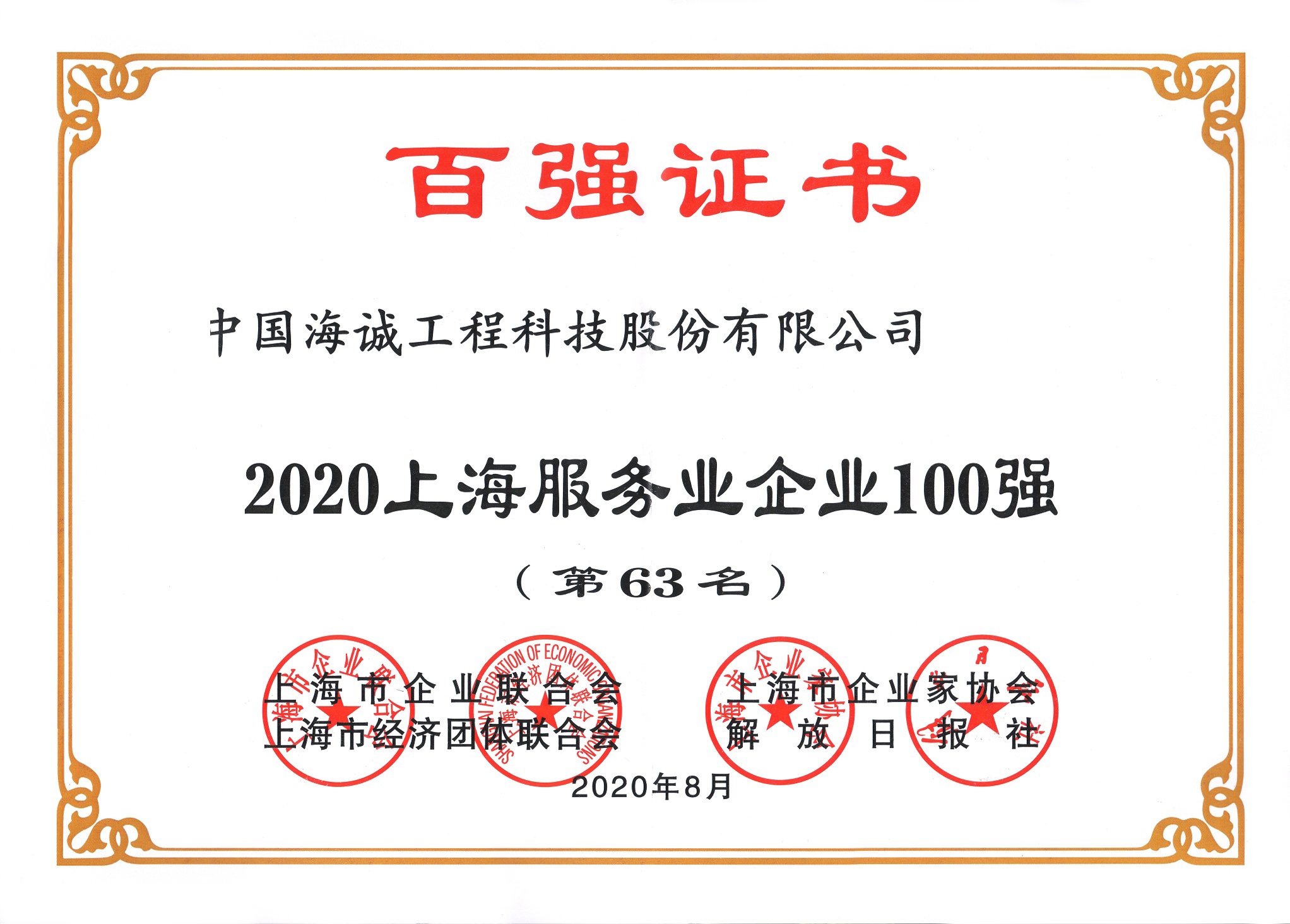 8月18日,由上海市企業(yè)聯(lián)合會、上海市企業(yè)家協(xié)會、上海市經(jīng)濟團體聯(lián)合會、解放日報社聯(lián)合主辦的“2020上海百強企業(yè)發(fā)布會”在滬舉辦。會上發(fā)布了“2020上海服務業(yè)企業(yè)100強”等榜單。海誠股份再次入圍“2020上海服務業(yè)企業(yè)100強”,排名第63位。