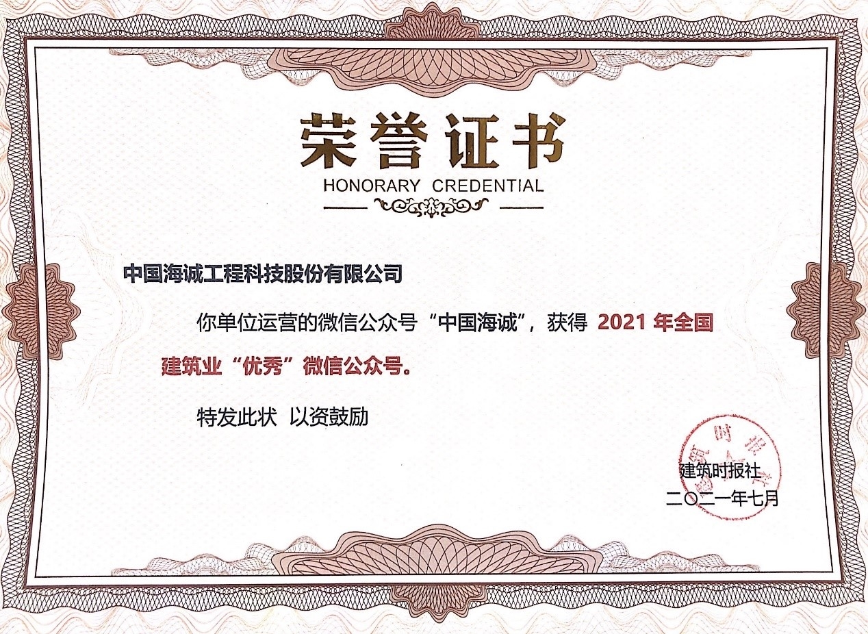 7月16日,由建筑時(shí)報(bào)社主辦的2021建筑業(yè)微信公眾號運(yùn)維經(jīng)驗(yàn)交流研討會(huì)暨全國建筑業(yè)優(yōu)秀公眾號頒獎(jiǎng)典禮在揚(yáng)州召開。中國海誠官方微信公眾號榮獲“2021年全國建筑業(yè)優(yōu)秀微信公眾號”。這是公司繼去年獲獎(jiǎng)后連續(xù)兩年獲此殊榮。
