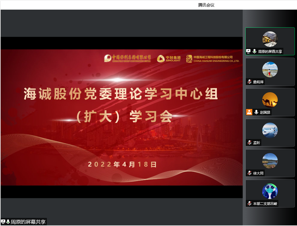 2022年4月18日下午,海誠股份黨委以視頻會議形式,召開2022年度第一次理論中心組(擴大)學習會。會議主題是“科技引領、創(chuàng)新賦能”。會議由公司黨委書記、董事長趙國昂主持,公司領導班子成員、總部職能部門負責人、各直屬黨支部書記、技術研發(fā)中心員工等31人參加了學習。