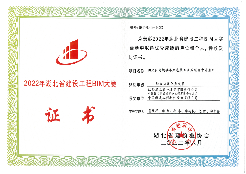 近日,湖北省建筑業(yè)協(xié)會(huì)對(duì)2022年度湖北省建設(shè)工程大賽成果進(jìn)行公布,中國(guó)海誠(chéng)武漢公司主導(dǎo)完成的“BIM在黃鶴樓卷煙包裝工業(yè)園項(xiàng)目中的技術(shù)應(yīng)用”榮獲綜合類優(yōu)秀成果獎(jiǎng)。