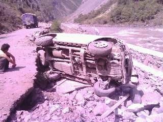 彭云:有天中午,我們從夾壁鄉(xiāng)衛(wèi)生院巡查完趕去另一個(gè)工地,兩個(gè)工地之間有一段未完工的317國道路基。受地震影響,道路遭受嚴(yán)重的破壞,兩邊山上時(shí)有滾石掉下。車在顛簸、搖晃中緩慢行駛,過了畢棚溝路口的小橋后是一個(gè)急轉(zhuǎn)彎。突然,前面從山上滾下一根木頭橫在車前,司機(jī)劉定峰大喊一聲“壞了!”,瞬間車子跳起來,劇烈搖晃,我下意識抱住了頭,身體在車內(nèi)左右撞擊,周圍的東西在搖晃,車在旋轉(zhuǎn),十幾秒鐘以后,一切戛然停止。我們又怔了十幾秒,“大家沒事吧?”我們異口同聲問道,我試著動了動四肢,沒受傷,其他人也都沒有受傷。在附近目睹這驚險(xiǎn)場面的工友們?nèi)颗苓^來拉我們出去。從車子里出來后,我們發(fā)現(xiàn)側(cè)翻車輛離河邊只有兩米!也要感謝劉定峰,在車摔到坑里前他死死的抓住方向盤,踩著剎車,避免了更大的險(xiǎn)情發(fā)生。