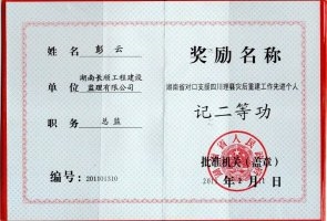 2011年,湖南省政府授予長順項(xiàng)目管理有限公司湖南省對口支援四川理縣援建先進(jìn)單位的光榮稱號。由長順公司承監(jiān)三湘大道、商貿(mào)中心等項(xiàng)目獲四川天府杯金獎(jiǎng),理縣中學(xué)項(xiàng)目獲四川天府杯銀獎(jiǎng)。講述者彭云榮獲湖南省政府頒發(fā)的二等功勛章和獎(jiǎng)狀,并獲邀參加湖南省委省政府領(lǐng)導(dǎo)接見表彰。