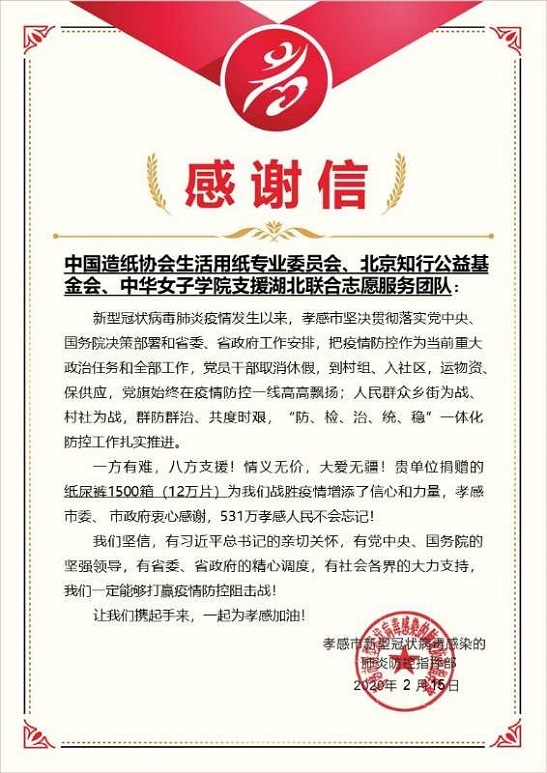 “加油武漢”愛心募捐倡議活動旨在發(fā)動衛(wèi)生用品行業(yè)愛心企業(yè)和愛心人士力量,籌集善款購買成人紙尿褲、成人拉拉褲、經(jīng)期褲,馳援武漢奮戰(zhàn)在抗疫一線的醫(yī)護(hù)人員,齊心協(xié)力抗擊疫情?;顒影l(fā)起后,衛(wèi)品行業(yè)22家企業(yè)、63位個人迅速響應(yīng),為抗擊疫情捐獻(xiàn)愛心。截至2月13日,基金會收到捐款169.6882萬元。其中,造紙?jiān)壕杩?萬元。