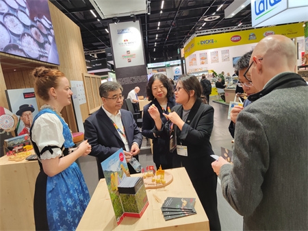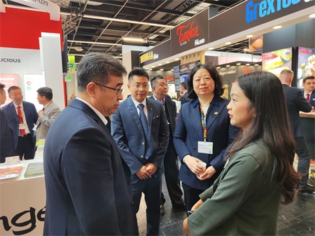 展臺首日即吸引了來自歐亞等產業(yè)鏈上下游參展企業(yè)和觀眾的持續(xù)關注。保利集團總經理助理,保利中輕黨委書記、董事長安勝杰來到中國食品發(fā)酵工業(yè)研究院展臺,親切慰問參展員工,并前往安琪酵母、加拿大Saputo乳業(yè)公司、法國SILL SAS集團、荷蘭Salud Foodgroup Europe BV等相關展臺進行交流,與世界食品博覽會(Anuga)主辦方就未來有關合作進行交流,并接受主辦方專題采訪。