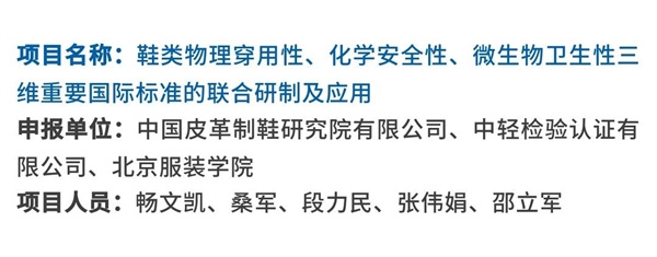 中國皮革制鞋院聯(lián)合申報的“鞋類物理穿用性、化學(xué)安全性、微生物衛(wèi)生性三維重要國際標(biāo)準(zhǔn)的聯(lián)合研制及應(yīng)用”項目,主導(dǎo)制定的國際標(biāo)準(zhǔn)ISO19574、ISO20535和ISO19577,打破多年來歐盟成員國技術(shù)壟斷,實現(xiàn)我國在鞋類微生物、物理和化學(xué)領(lǐng)域國際標(biāo)準(zhǔn)的突破,填補物理和化學(xué)檢測方法標(biāo)準(zhǔn)的國際空白。