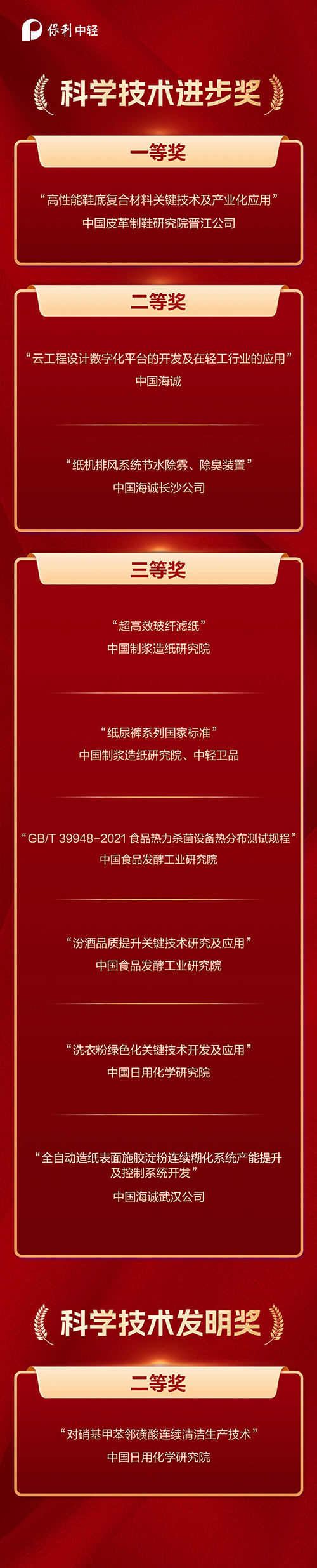 近日,“2024年中國輕工業(yè)聯(lián)合會科學(xué)技術(shù)獎”評選結(jié)果正式揭曉。保利中輕榮獲中國輕工業(yè)聯(lián)合會科學(xué)技術(shù)進(jìn)步獎一等獎1項、二等獎2項、三等獎6項,科學(xué)技術(shù)發(fā)明獎二等獎1項。