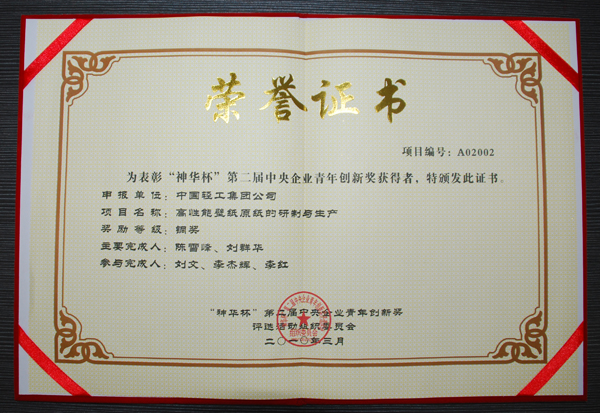 3月30日,“神華杯”第二屆中央企業(yè)青年創(chuàng)新獎(jiǎng)表彰大會在京舉行,國資委主任李榮融發(fā)表重要講話。中國輕工集團(tuán)公司“高性能壁紙?jiān)埖难兄婆c生產(chǎn)”項(xiàng)目榮獲“神華杯”第二屆中央企業(yè)青年創(chuàng)新獎(jiǎng)銅獎(jiǎng),該項(xiàng)目由中國制漿造紙研究院研究開發(fā)部特種紙技術(shù)研發(fā)中心完成。