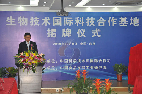 揭牌儀式上,靳曉明司長和陳鄂生董事長分別致辭。靳司長指出,科技的靈魂在于開放,食品行業(yè)作為國民經(jīng)濟的重要支柱產(chǎn)業(yè),技術(shù)的進步離不開國際合作。希望以設(shè)立生物技術(shù)“國際科技合作基地”為契機,積極參加國際科技合作交流活動,充分利用國際資源,進一步挖掘潛力,引進高級人才,使基地真正成為“技術(shù)領(lǐng)先、人才聚集”的國際科技創(chuàng)新中心。陳董事長要求,食品發(fā)酵院要深刻領(lǐng)會科技部《“十一五”國際合作規(guī)劃綱要》精神,緊密圍繞建設(shè)創(chuàng)新型國家的總體目標(biāo),切實提高自主創(chuàng)新能力,建設(shè)“項目基地人才”一體化的國際科技研發(fā)高地。蔡院長代表基地建設(shè)單位發(fā)表講話。