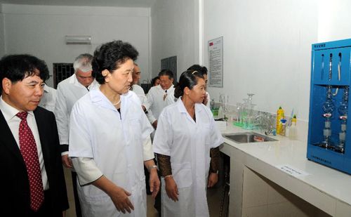 陳鄂生董事長(zhǎng)陪同國(guó)務(wù)委員劉延?xùn)|(中)、柬埔寨副首相梅森安(右一)參觀實(shí)驗(yàn)室(一)